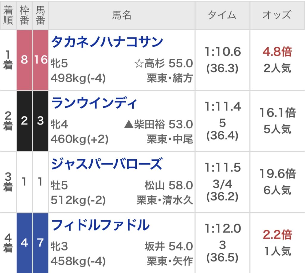 調教評価からタカネノハナコサンが勝ち切ると予想し、